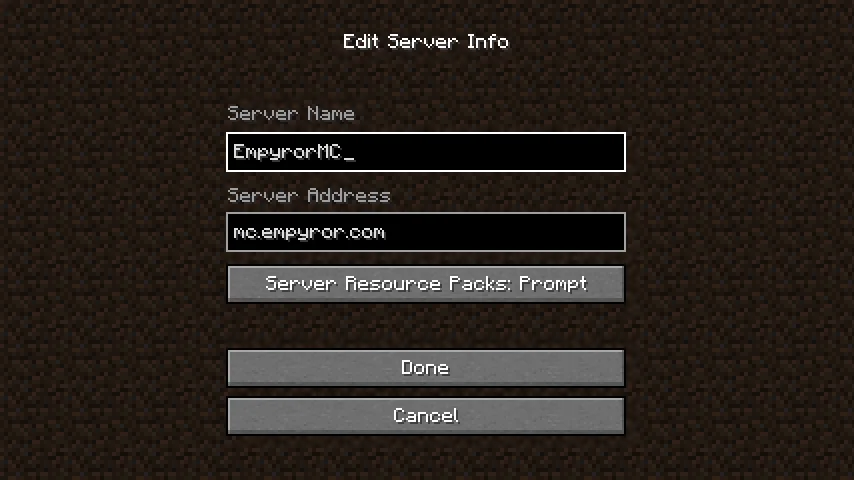 - Enter a server name of your liking and enter the server address of “mc.empyror.com”